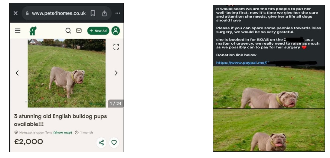 A pop-up rescue with the same name as a reputable rescue had taken this photo from an advert and cropped off the watermark at the bottom. They then used it to ask for donations on their website. We asked P4H if they intend to move their watermark to deter theft but unfortunately, they do not have any plans to change the position, as buyers need to see the animals’ face. We did challenge this with P4H and they agreed to look into it.